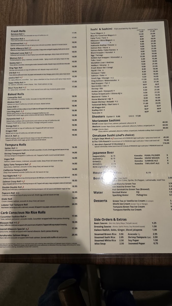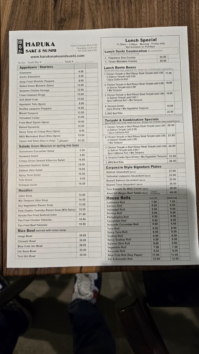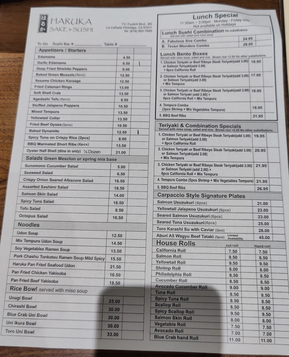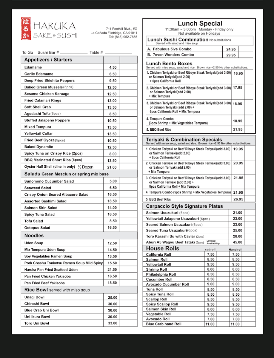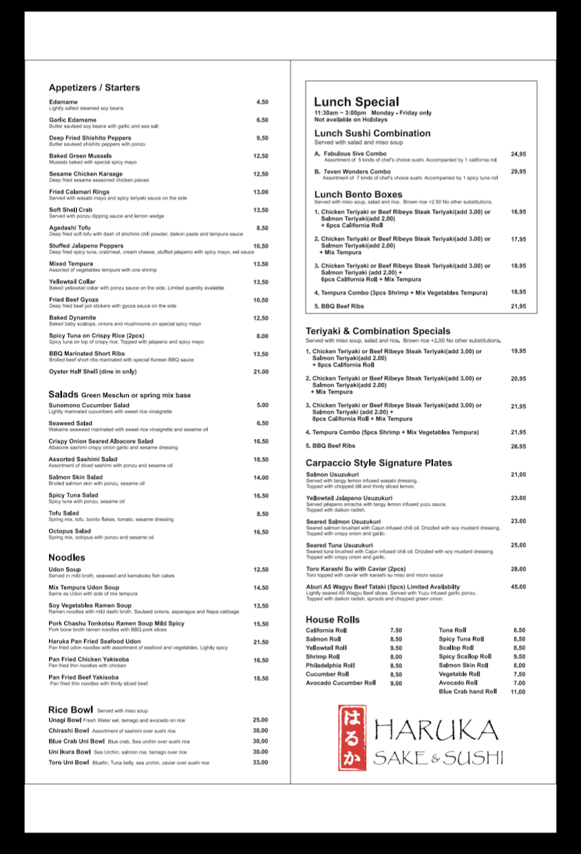From a reviewer’s perspective, the menu at Haruka Sake And Sushi feels both diverse and thoughtfully curated, offering something for every type of diner. Standouts include the hearty Teriyaki Combination With California Roll & Mix Tempura and the indulgent Bbq Beef Ribs Combination Specials, while rice bowls like the luxurious Uni Ikura Bowl and Toro Uni Bowl highlight the restaurant’s focus on premium ingredients. The creative roll selection-ranging from baked options like the Lotus Roll and Energy Roll to crispy choices such as the Shrimp Tempura Roll and Spider Roll-adds variety and excitement. Lighter, innovative options like the Seared Albacore Special (no rice roll) and elegant plates such as Yellowtail Jalapeño Usuzukuri or Aburi A5 Wagyu Beef Tataki (5 Pieces) elevate the experience further. Classic staples like Edamame, Fried Beef Gyoza, and sushi selections including Fatty Tuna (Toro) and Monkfish Liver (Ankimo) ensure traditional flavors are well represented. To round things out, comforting noodles like Pork Chashu Tonkotsu Ramen Soup and desserts such as Mochi Ice Cream provide a satisfying finish. Overall, the menu balances creativity and authenticity, making it a memorable dining experience.