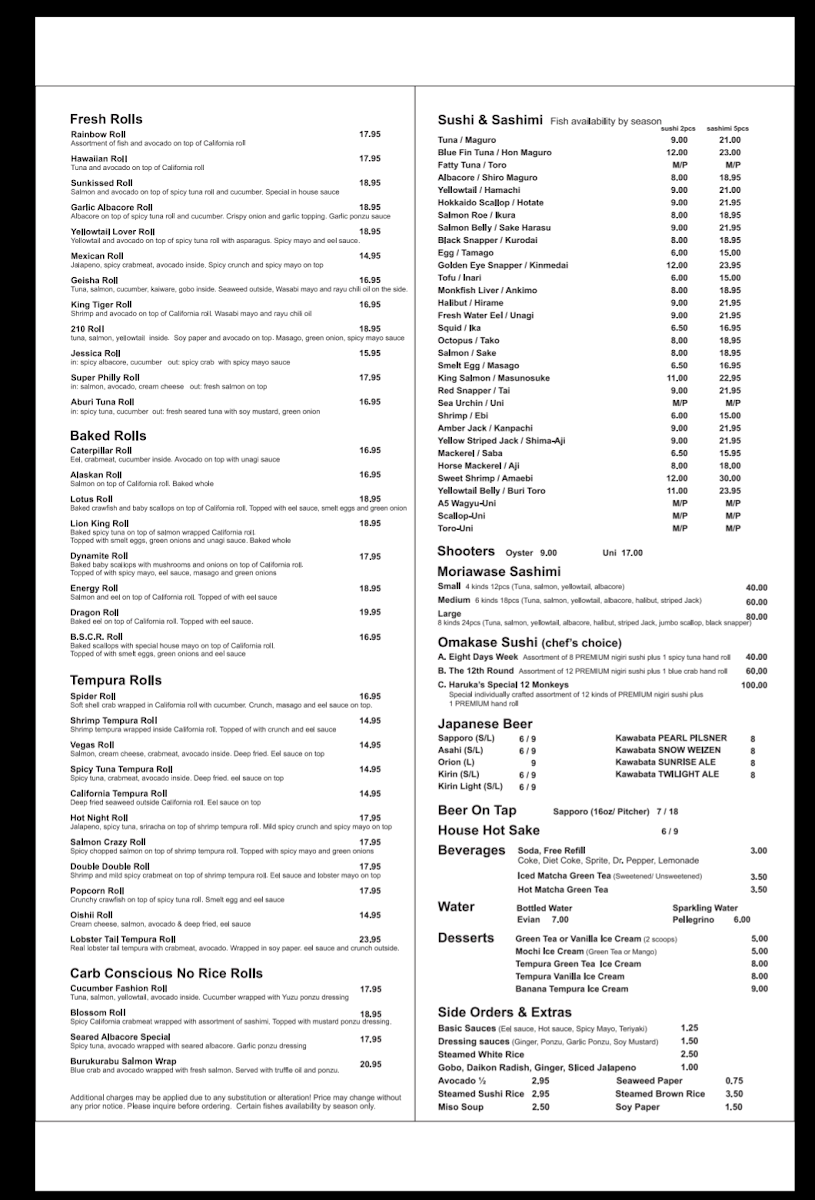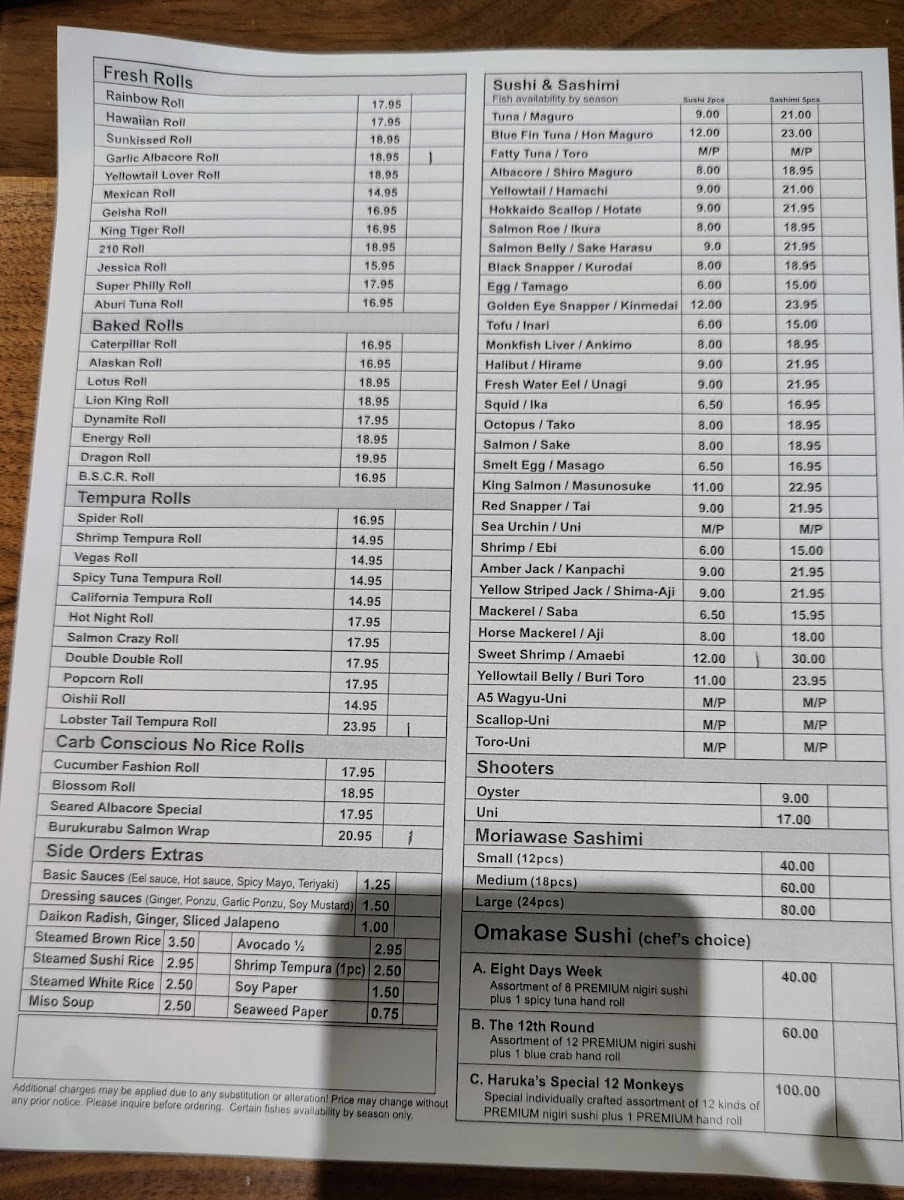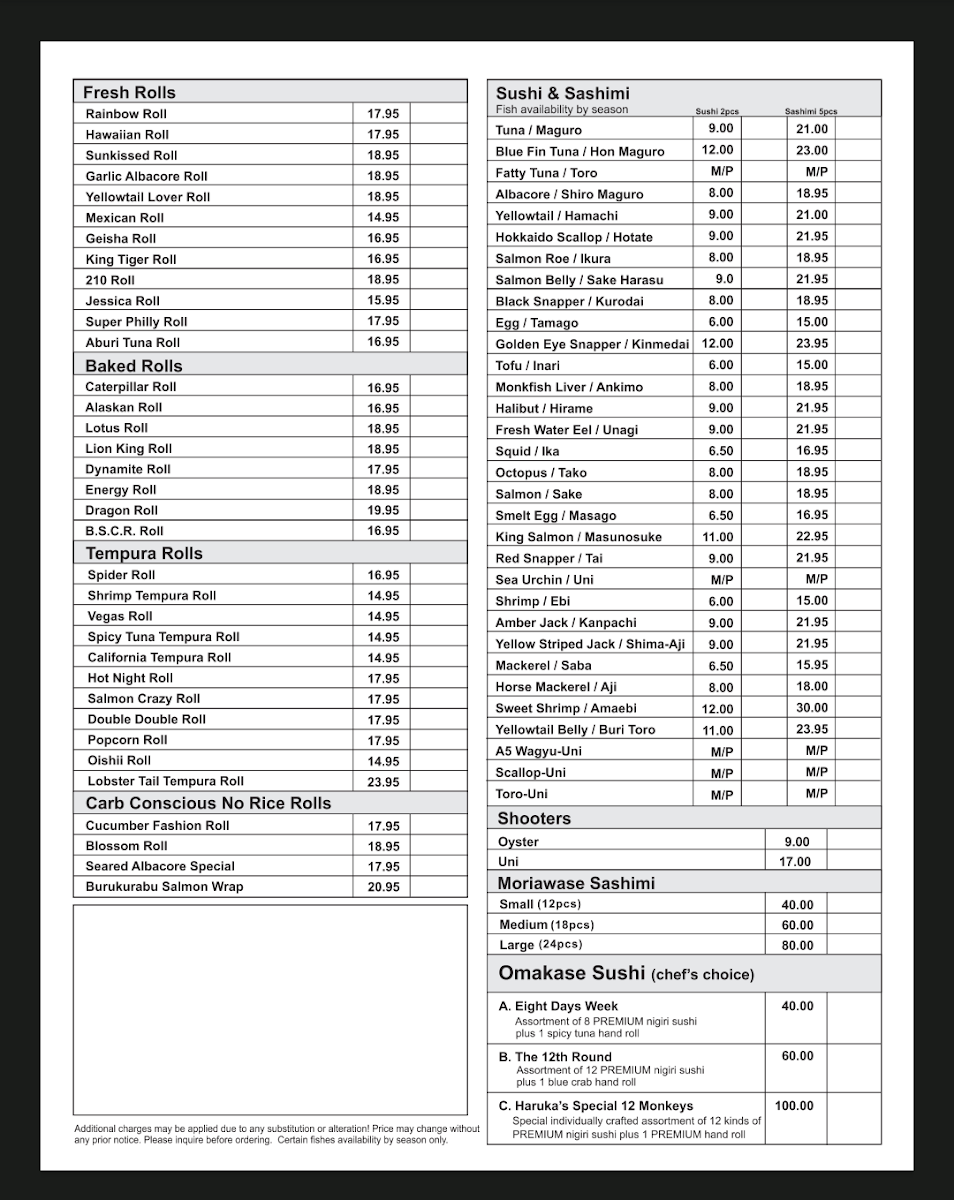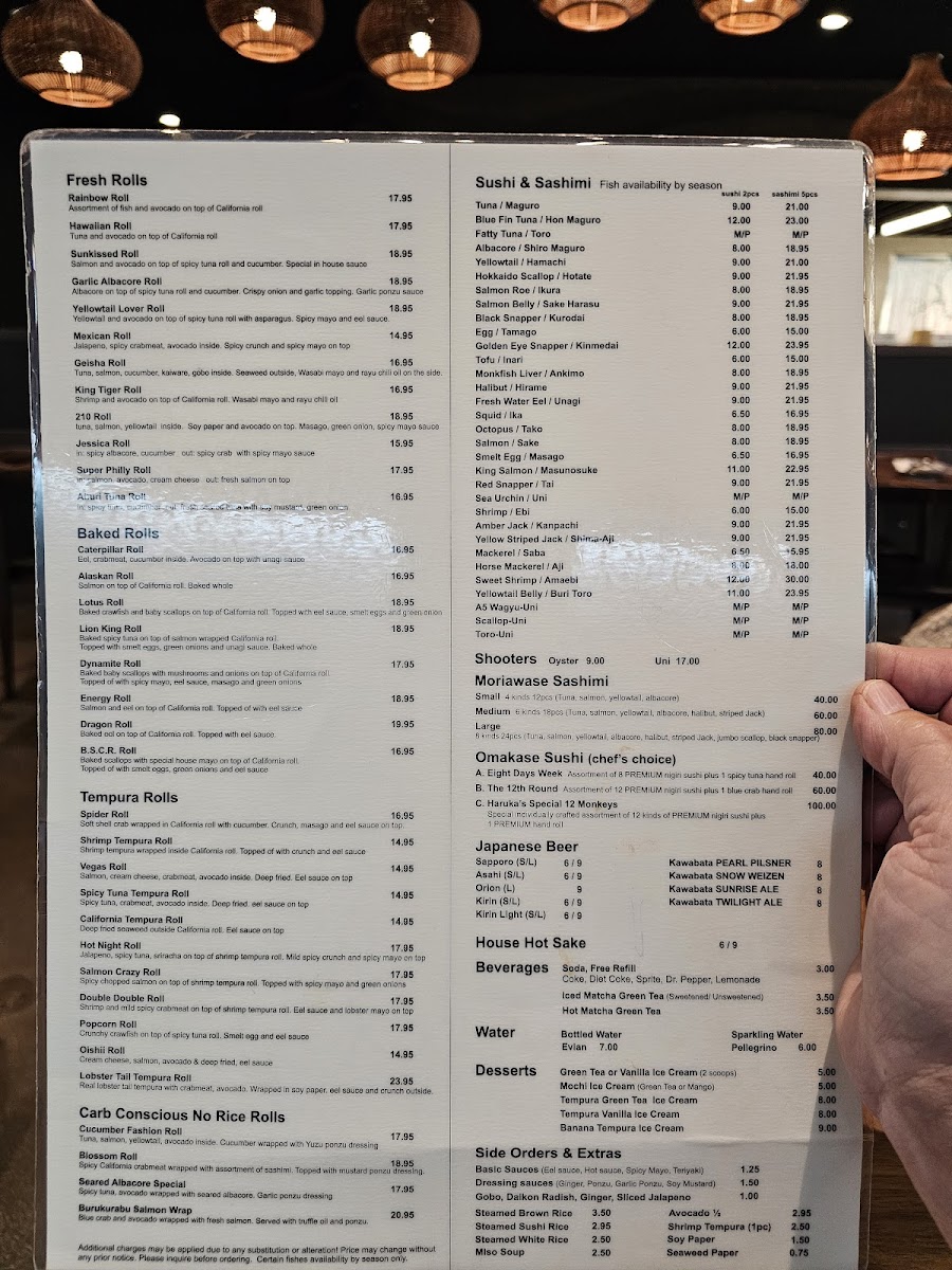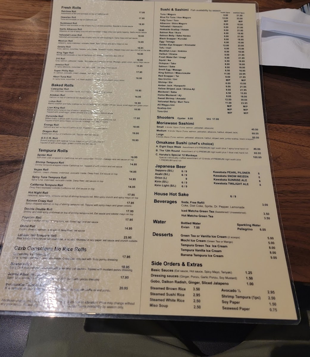 From a reviewer’s perspective, the menu at Haruka Sake And Sushi feels both diverse and thoughtfully curated, offering something for every type of diner. Standouts include the hearty Teriyaki Combination With California Roll & Mix Tempura and the indulgent Bbq Beef Ribs Combination Specials, while rice bowls like the luxurious Uni Ikura Bowl and Toro Uni Bowl highlight the restaurant’s focus on premium ingredients. The creative roll selection-ranging from baked options like the Lotus Roll and Energy Roll to crispy choices such as the Shrimp Tempura Roll and Spider Roll-adds variety and excitement. Lighter, innovative options like the Seared Albacore Special (no rice roll) and elegant plates such as Yellowtail Jalapeño Usuzukuri or Aburi A5 Wagyu Beef Tataki (5 Pieces) elevate the experience further. Classic staples like Edamame, Fried Beef Gyoza, and sushi selections including Fatty Tuna (Toro) and Monkfish Liver (Ankimo) ensure traditional flavors are well represented. To round things out, comforting noodles like Pork Chashu Tonkotsu Ramen Soup and desserts such as Mochi Ice Cream provide a satisfying finish. Overall, the menu balances creativity and authenticity, making it a memorable dining experience.